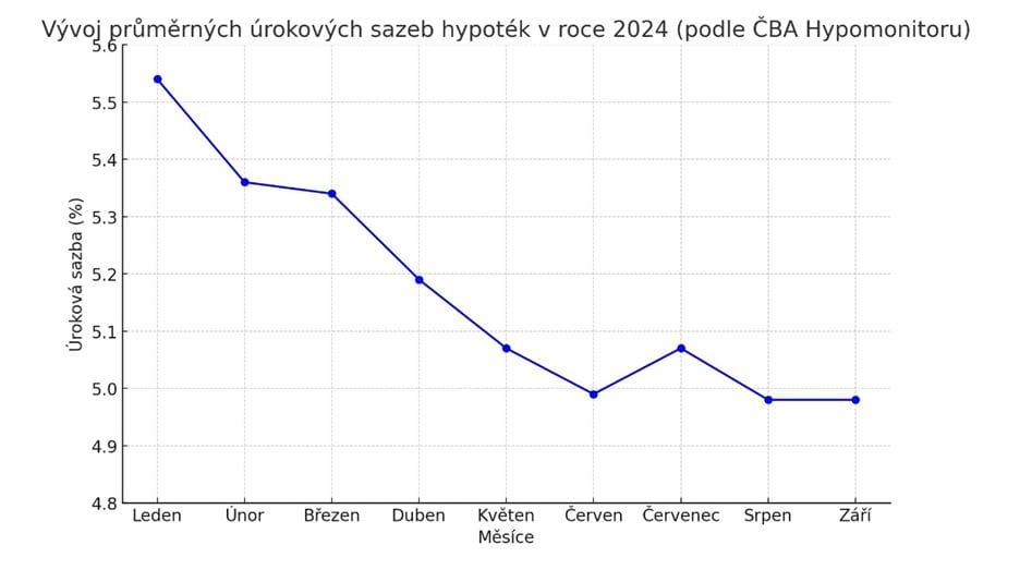 Rok 2024 přinesl postupný pokles úrokových sazeb, který vedl k oživení hypotečního trhu. V lednu podle Hypomonitoru České bankovní asociace činila průměrná hypoteční sazba nových hypoték 5,65 %, a byla tak nejnižší od poloviny roku 2022. V červnu 2024 klesla na 4,99 % a v srpnu činila 4,96 %.